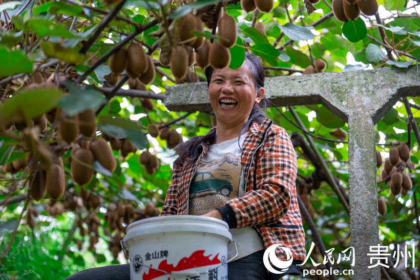 | Seorang penduduk kampung melemparkan senyumannya di sebuah kebun buah kiwi di kampung Pingtan, pekan Gubao, kaunti Xiuwen, Guiyang, di Provinsi Guizhou, barat daya China. (People’s Daily Online/Tu Min) |