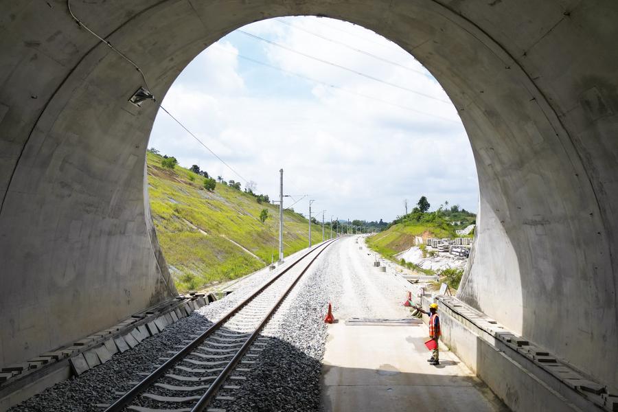 | Foto sudut udara bertarikh 10 Oktober 2025 memperlihatkan pemandangan luar jalan masuk sebuah terowong di lokasi projek ECRL di Pahang, Malaysia. (Xinhua) |