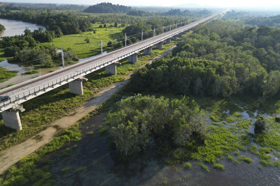 | Foto sudut udara bertarikh 10 Oktober 2025 mempamerkan pemandangan jambatan besar projek ECRL di Pahang, Malaysia. (Xinhua) |