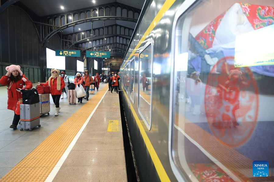 | Pelancong asing menaiki K7041, kereta api bertemakan budaya rakyat utara China, di provinsi Heilongjiang, timur laut China, 19 Januari 2026. |