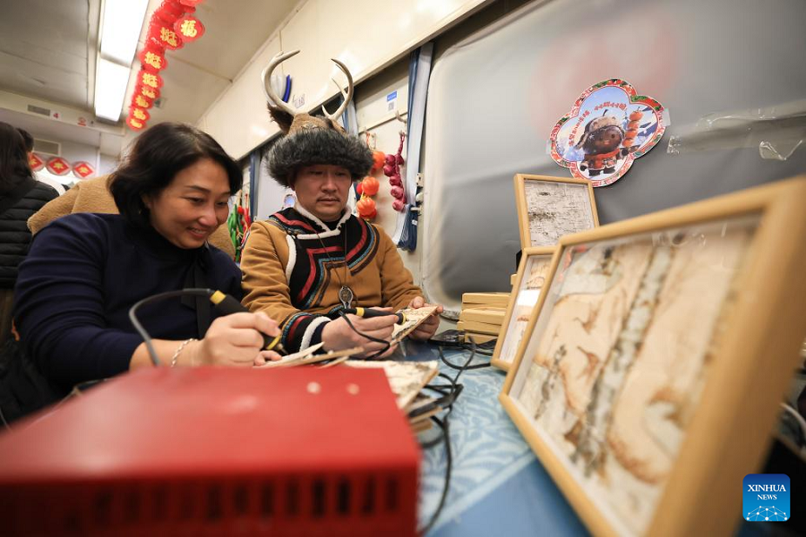 | Seorang pelancong dari Malaysia (kiri) mencuba teknik melukis etnik Elunchun di dalam K7041, kereta api yang bertemakan budaya rakyat utara China, di provinsi Heilongjiang, timur laut China, 19 Januari 2026. |