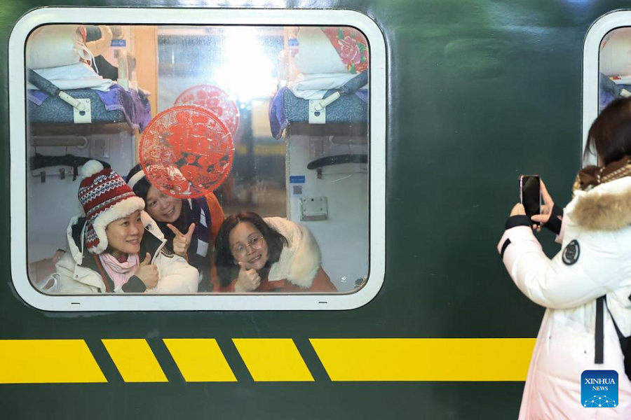 | Pelancong asing dan kakitangan bergambar di dalam K7041, kereta api bertemakan budaya rakyat utara China, di provinsi Heilongjiang, timur laut China, 19 Januari 2026. |