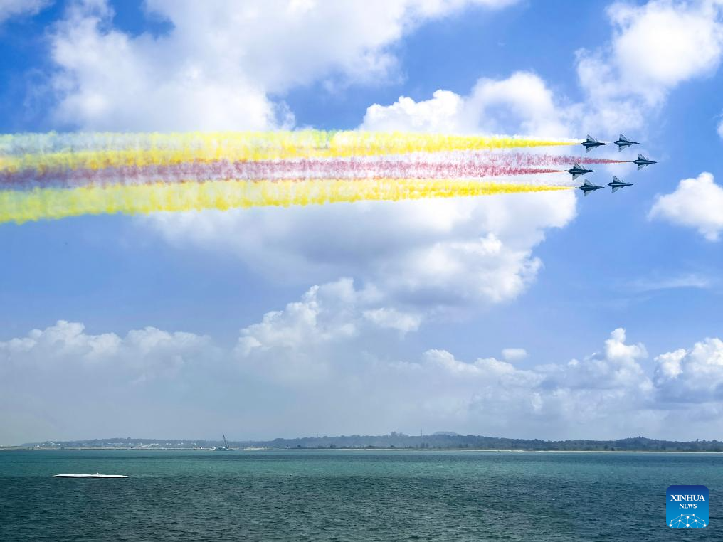 Aircraft of the Bayi Aerobatic Team of the Chinese People's Liberation Army (PLA) Air Force conduct a validation flight during the media preview for the 10th Singapore Airshow in Singapore, Feb. 1, 2026. The airshow will be held from Feb. 3 to 8 in Singapore. The appearance marks the team's return to the event since the seventh edition in February 2020. (Photo by Geng Yihao/Xinhua)